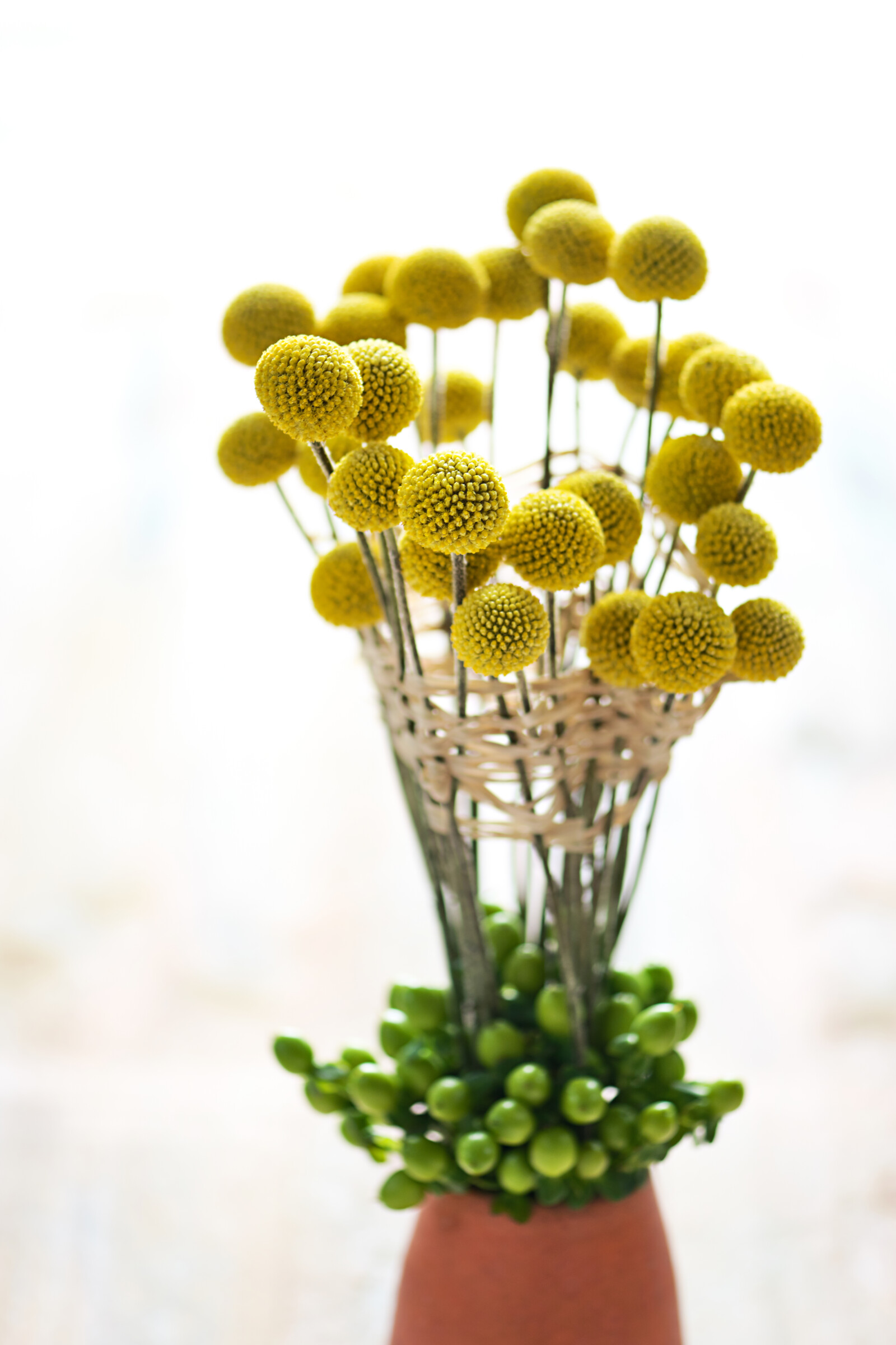 La Craspedia tiene un aspecto llamativo Su cabeza bulbosa, compuesta de diminutas flores amarillas, se asienta sobre un tallo largo y delgado.