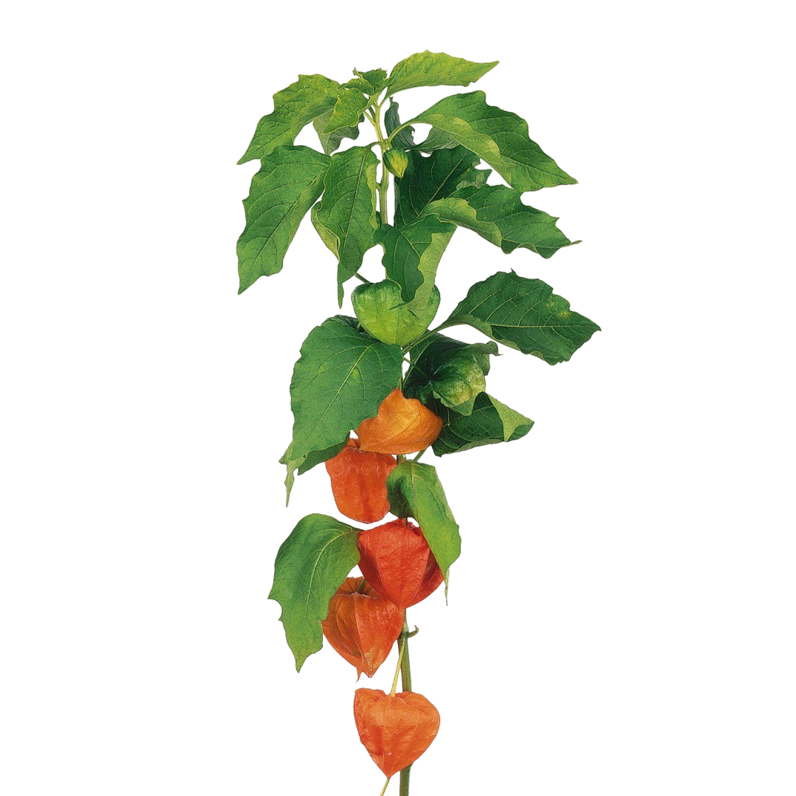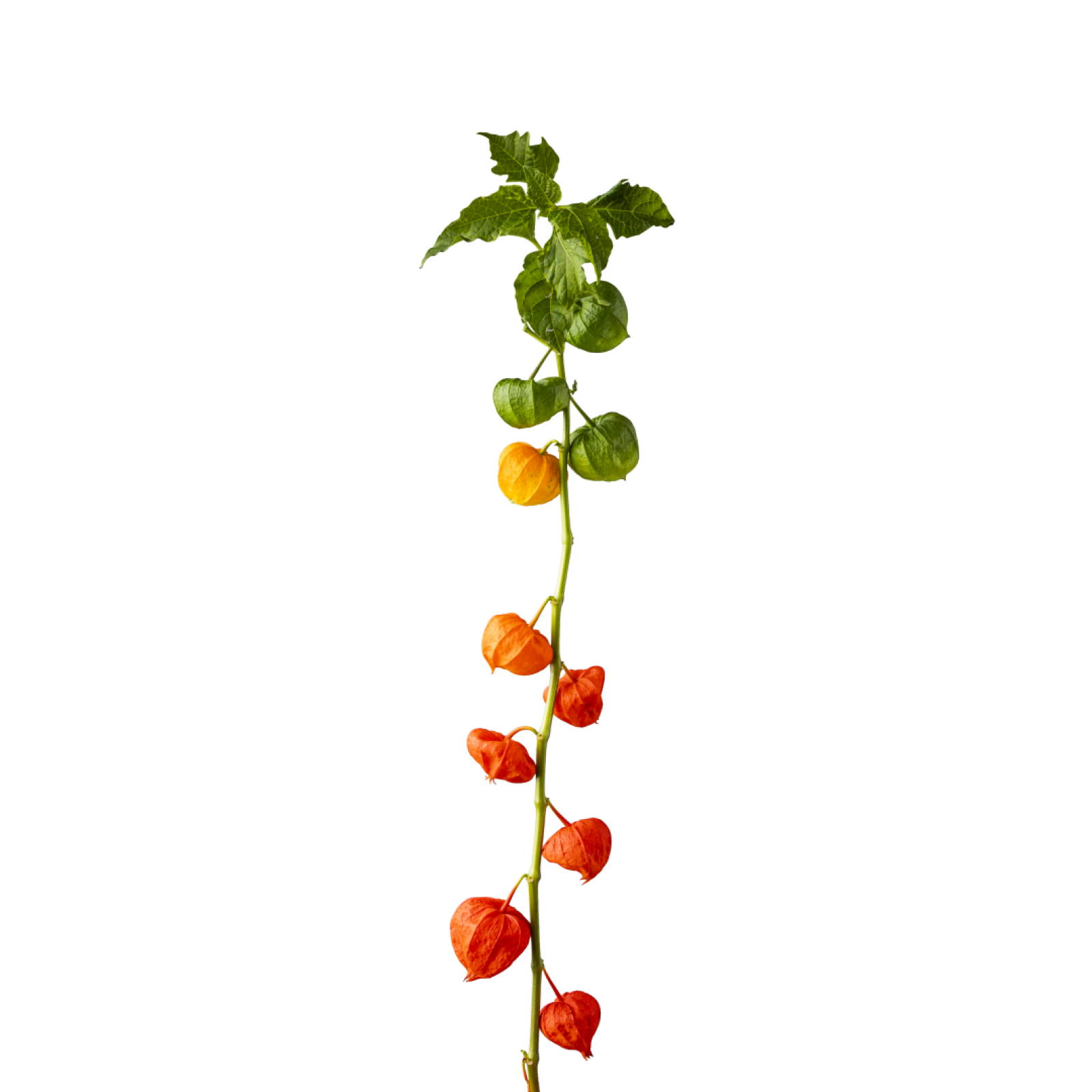 El Physalis tiene un tallo verde fresco con farolillos de color naranja.