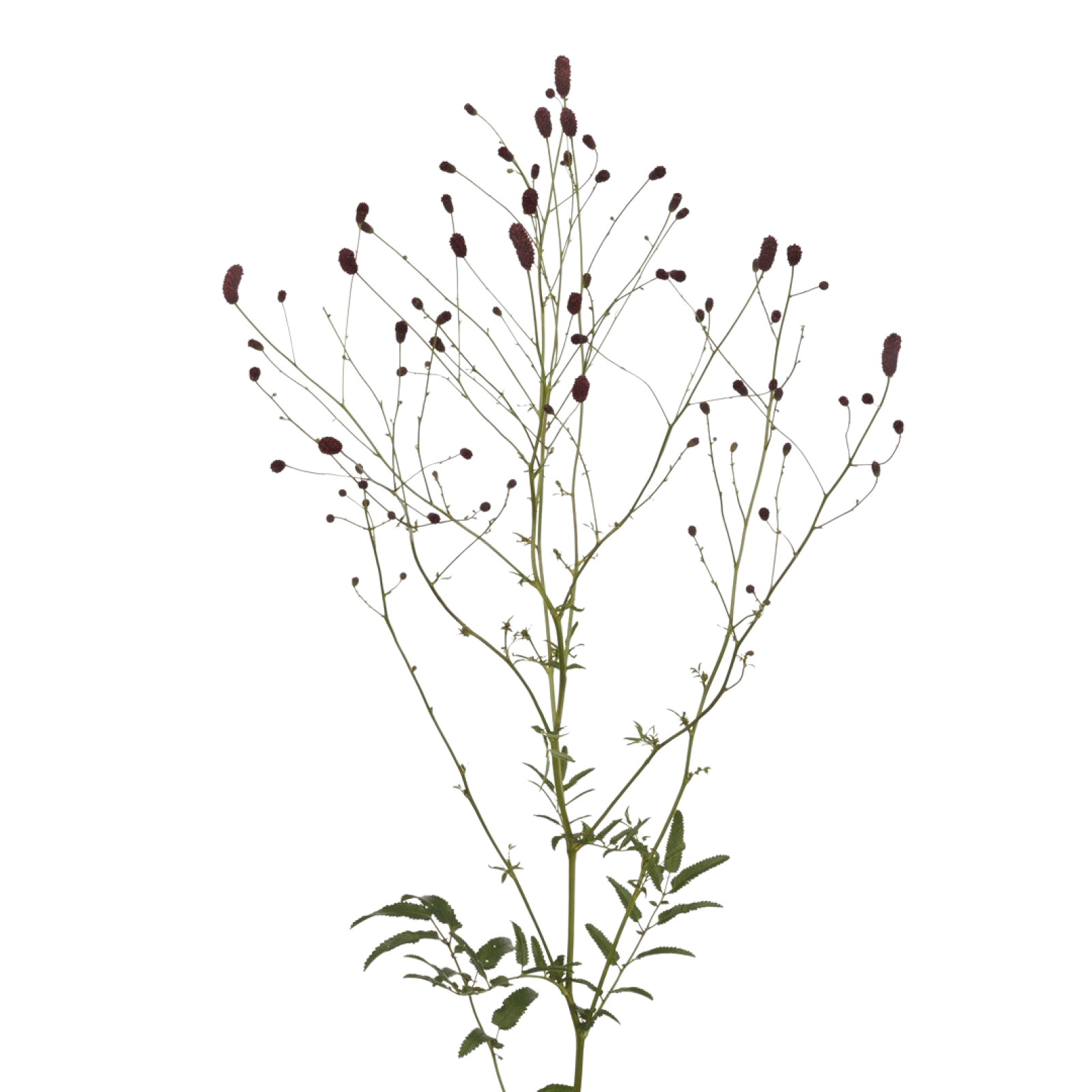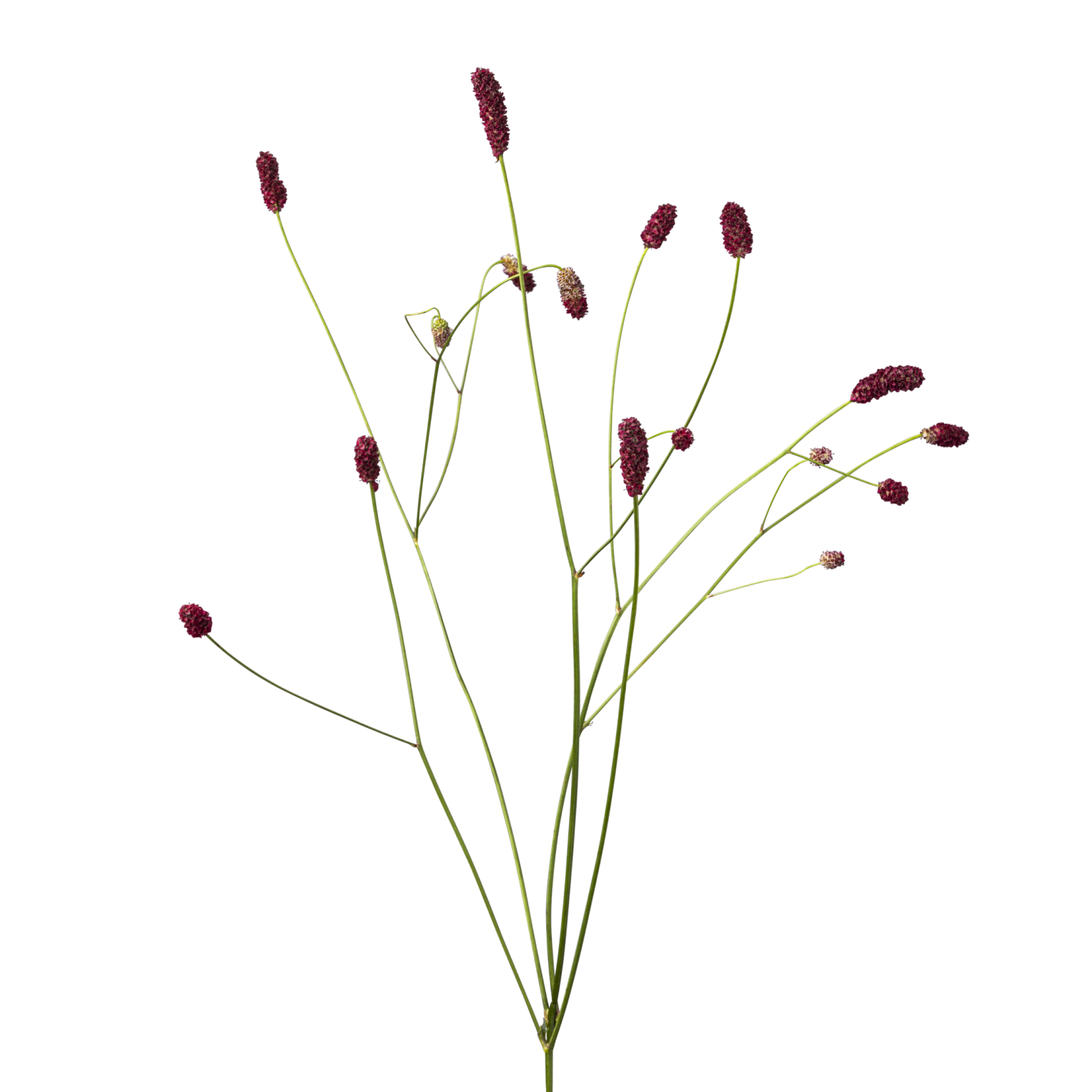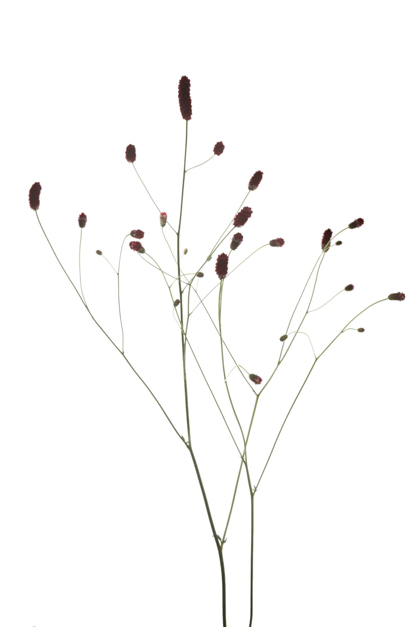 La Sanguisorba se compone de muchas flores pequeñas dispuestas en un tallo con una fuerte ramificación, lo que le da a la flor un aspecto lleno y exuberante. Las flores individuales son pequeñas y constan de numerosos estambres y estilos que se elevan por encima de la flor. Hay una gran variedad de cultivares, tallos muy largos, gruesos y ramificados con gruesos capullos sobre ellos, pero también otros más cortos y finamente ramificados con capullos más pequeños. Hay variedades con capullos erguidos y también con capullos caídos.