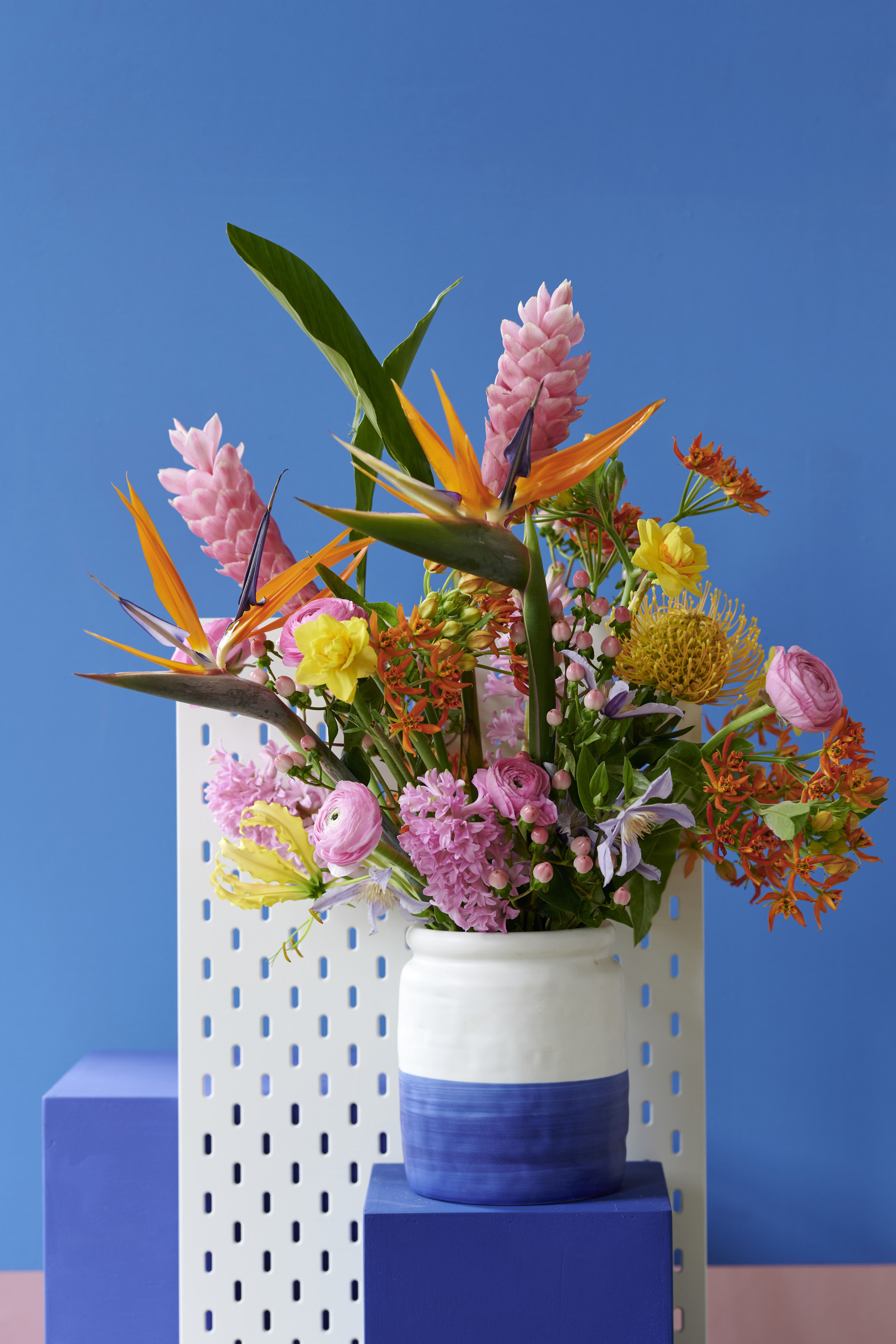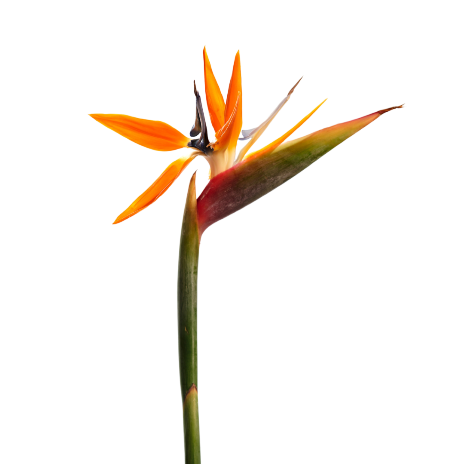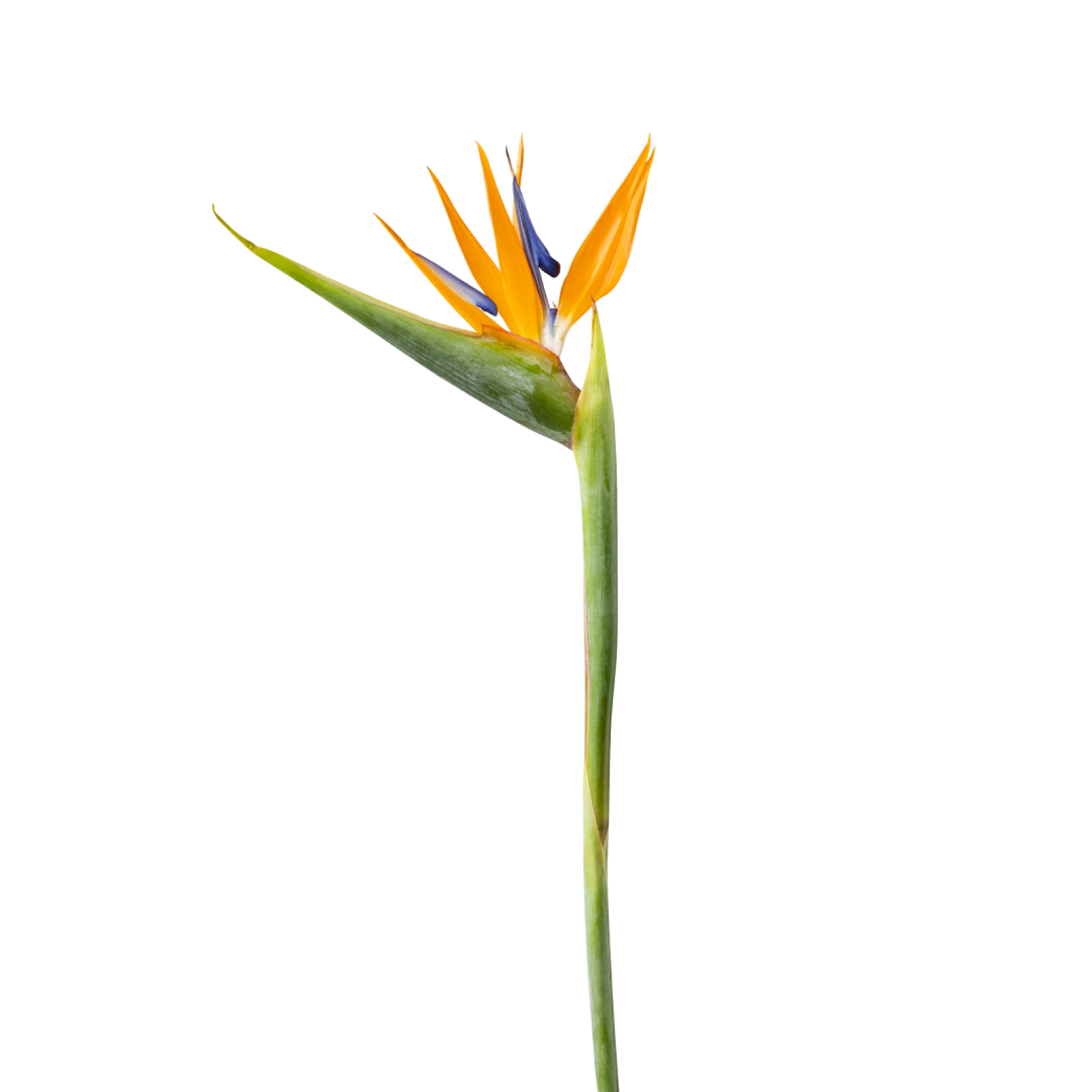 De aspecto llamativo y exótico, la strelitzia también se conoce como "flor ave del paraíso". La strelitzia se parece a un ave del paraíso, de ahí su nombre. Su sencillo tallo, coronado por un peine formado por elegantes brácteas abiertas de color naranja con dos o tres hojas de color azul rey, garantiza que no pasará fácilmente por alto esta asombrosa flor
