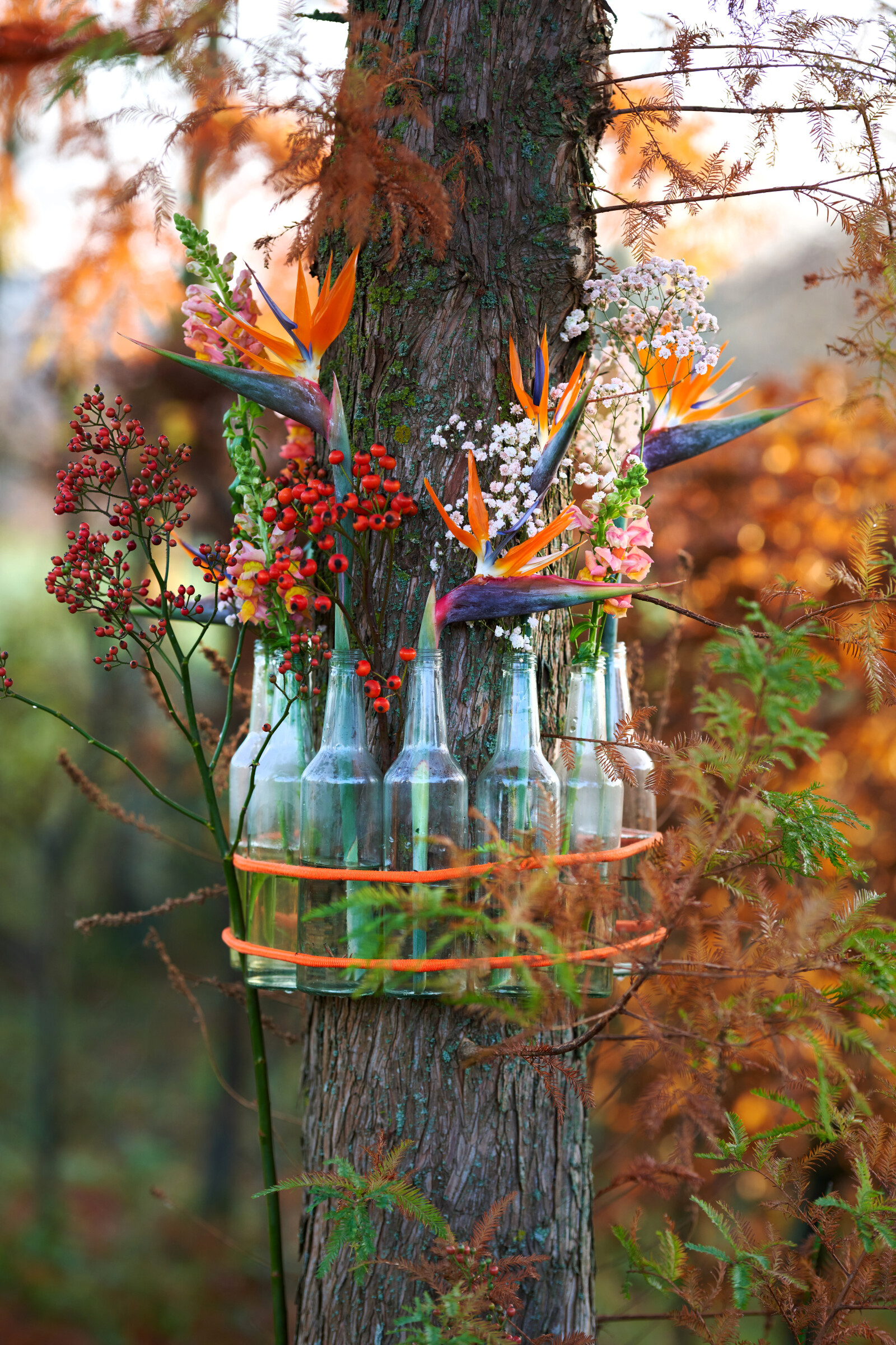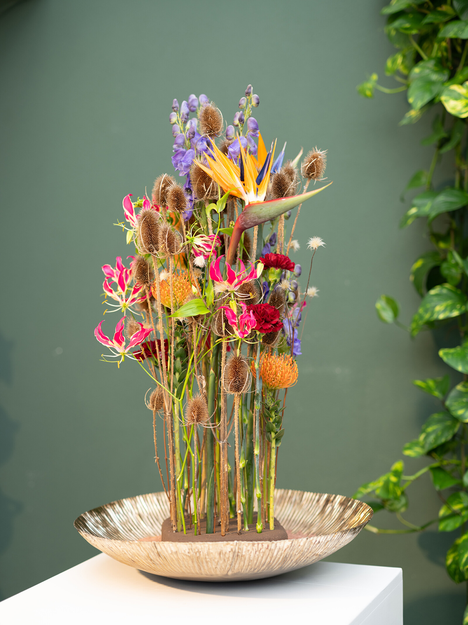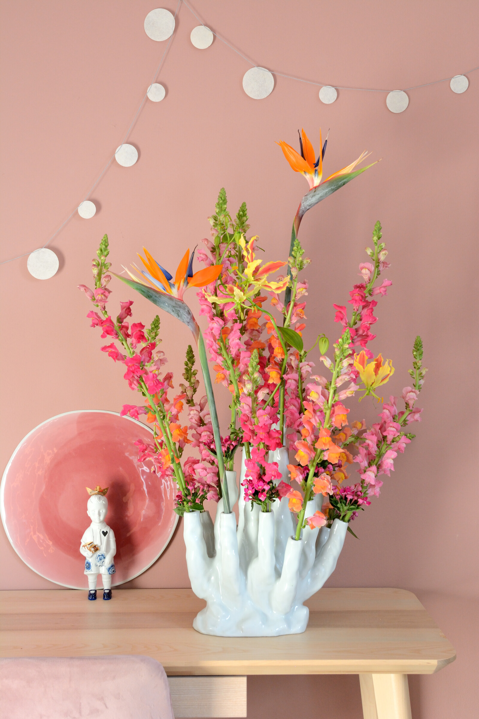 De aspecto llamativo y exótico, la strelitzia también se conoce como "flor ave del paraíso". La strelitzia se parece a un ave del paraíso, de ahí su nombre. Su sencillo tallo, coronado por un peine formado por elegantes brácteas abiertas de color naranja con dos o tres hojas de color azul rey, garantiza que no pasará fácilmente por alto esta asombrosa flor