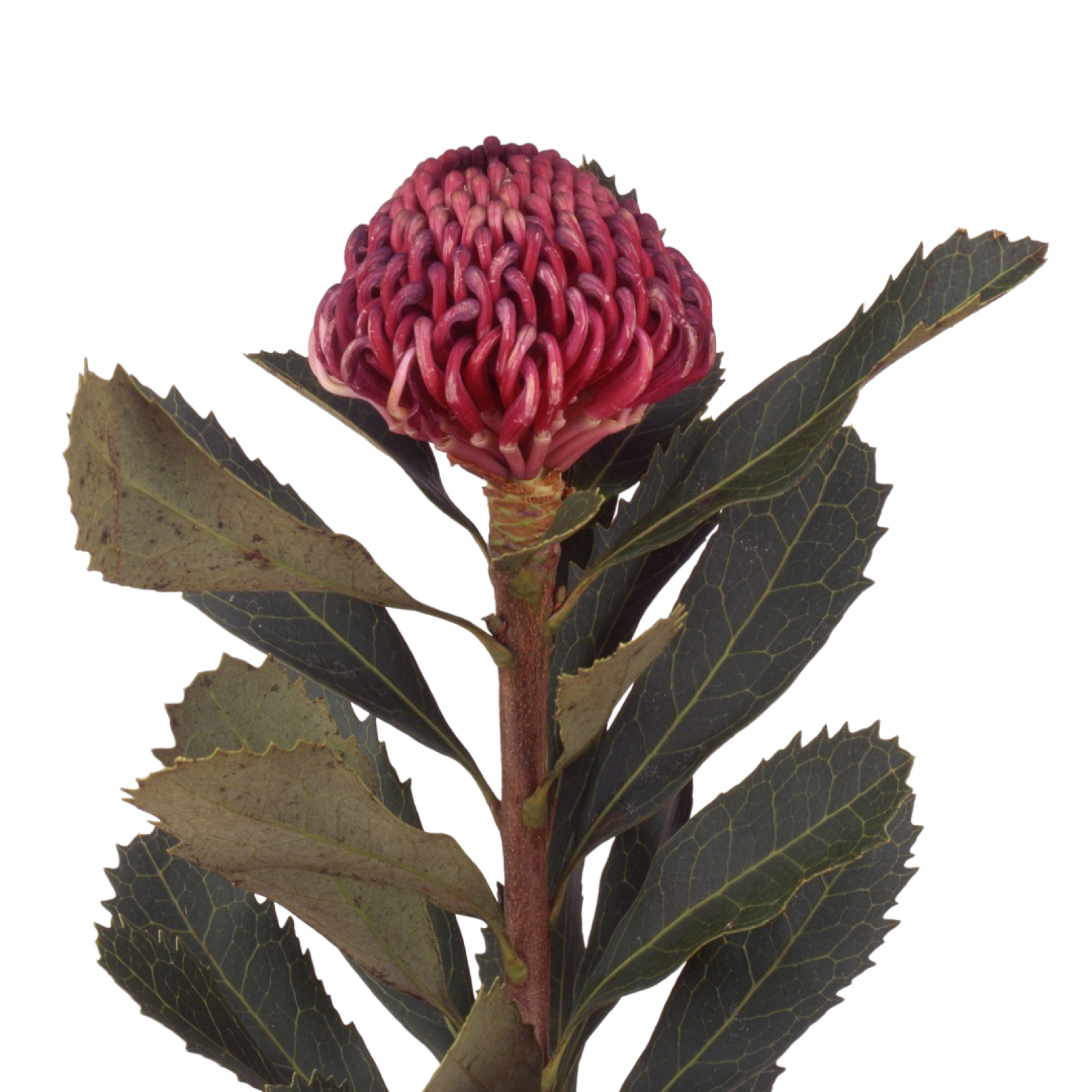 La waratah, también conocida como telopea, es una flor que se caracteriza por sus grandes y llamativos capítulos y su color rojo intenso. Esta flor simboliza la fuerza y la belleza, por lo que es perfecta para crear ramos impresionantes.