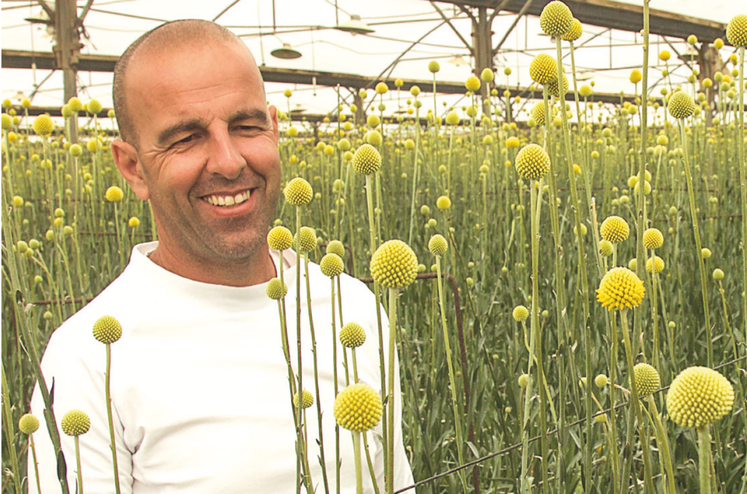 Almog Malca nos permite echar un vistazo a su vivero: bolleties amarillos hasta donde alcanza la vista. Un espectáculo maravilloso. Cada planta forma una roseta de la que crece un largo tallo. La inflorescencia, como un sol, atrae todas las miradas.